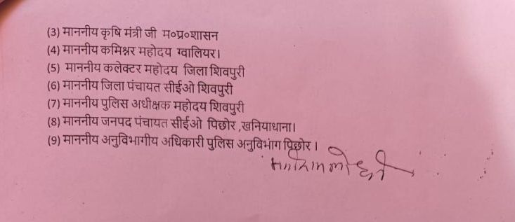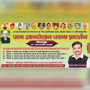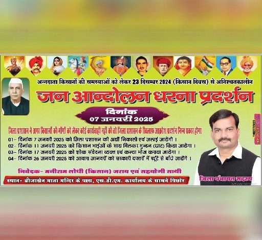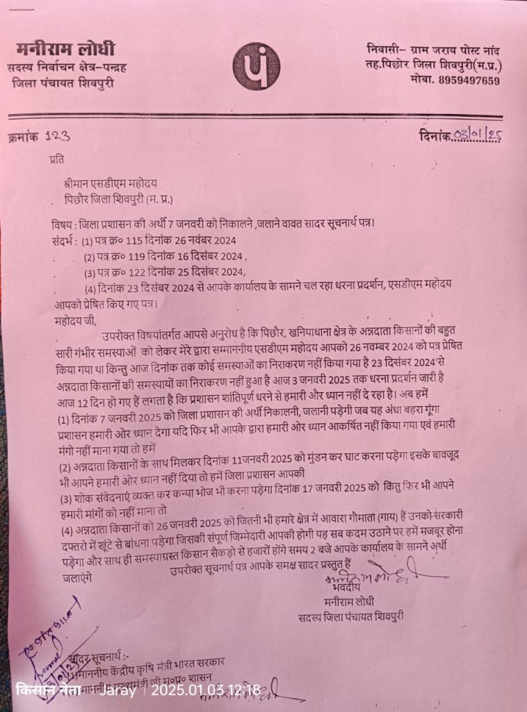 जानकारी के अनुसार जिला पंचायत सदस्य मनीराम लोधी द्वारा बताया गया की पिछोर तहसील में वर्षों से पड़े लंबित प्रकरण नामांतरण, सीमांकन, दुरुस्ती,नामसुधार, बटवारा, आदि प्रकरणो के निराकरण को लेकर मेरे द्वारा एसडीएम पिछोर को गरीब अन्नदाता किसानों की समस्याओं को लेकर 26 नवंबर 2024 तथा 16 दिसंबर 2024 को समस्याओं के निराकरण के लिए आवेदन पत्र दिए थे किंतु उसका कोई भी निराकरण नहीं किया गया जिस कारण से मजबूर होकर पिछोर विधानसभा क्षेत्र के समस्त अन्नदाता किसानों द्वारा 23 दिसंबर 2024 (किसान दिवस) को समस्याओं को लेकर अनिश्चितकालीन धरना प्रदर्शन रखना पड़ा! धरने के दौरान सैकड़ो किसान टेंट के नीचे अपनी रात बिता रहे हैं किंतु प्रशासन का इस और कोई ध्यान नहीं दिया जा रहा है ना ही प्रशासन की ओर से कोई आश्वासन दिया जा रहा है! उन्होंने कहा है कि जिला प्रशासन ने अगर किसानों की मांगों को लेकर कोई कार्यबाही नहीं की तो जिला प्रशासन के खिलाफ आक्रोश प्रदर्शन किया जाएगा जिसमें 07 जनवरी को किसानों द्वारा जिला प्रशासन की अर्थी निकाली जाएगी एवं जलाई जाएगी, 11 जनवरी को किसान भाइयों के साथ मिलकर मुंडन किया जाएगा तथा 17 जनवरी को शोक संवेदना व्यक्तकर, कन्या भोज कराया जाएगा इसके साथ ही 28 जनवरी 2025 को आवारा जानवरों को लेकर सरकारी दफ्तरों में खूंटे से बांधे जाएंगे! इस हेतु एसडीएम कार्यालय में सूचना देकर परमिशन ले ली गई है!